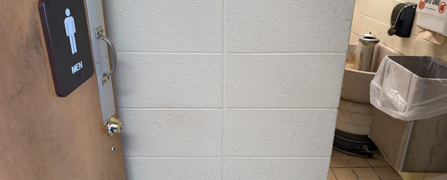 Lower-level restroom is currently functional. This serves as an example of a working facility, though accessibility and capacity for building users should be evaluated relative to overall demand
